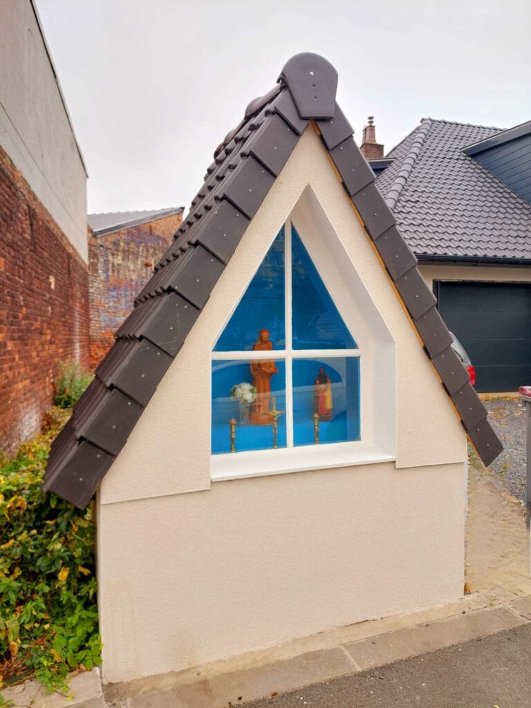 Primitivement intégrée à une vaste ferme en carré datée de 1830, l’ancienne chapelle fut démolie puis reconstruite en 1968 sous la forme d’un modeste oratoire en front de rue, à la suite de la destruction de la ferme.